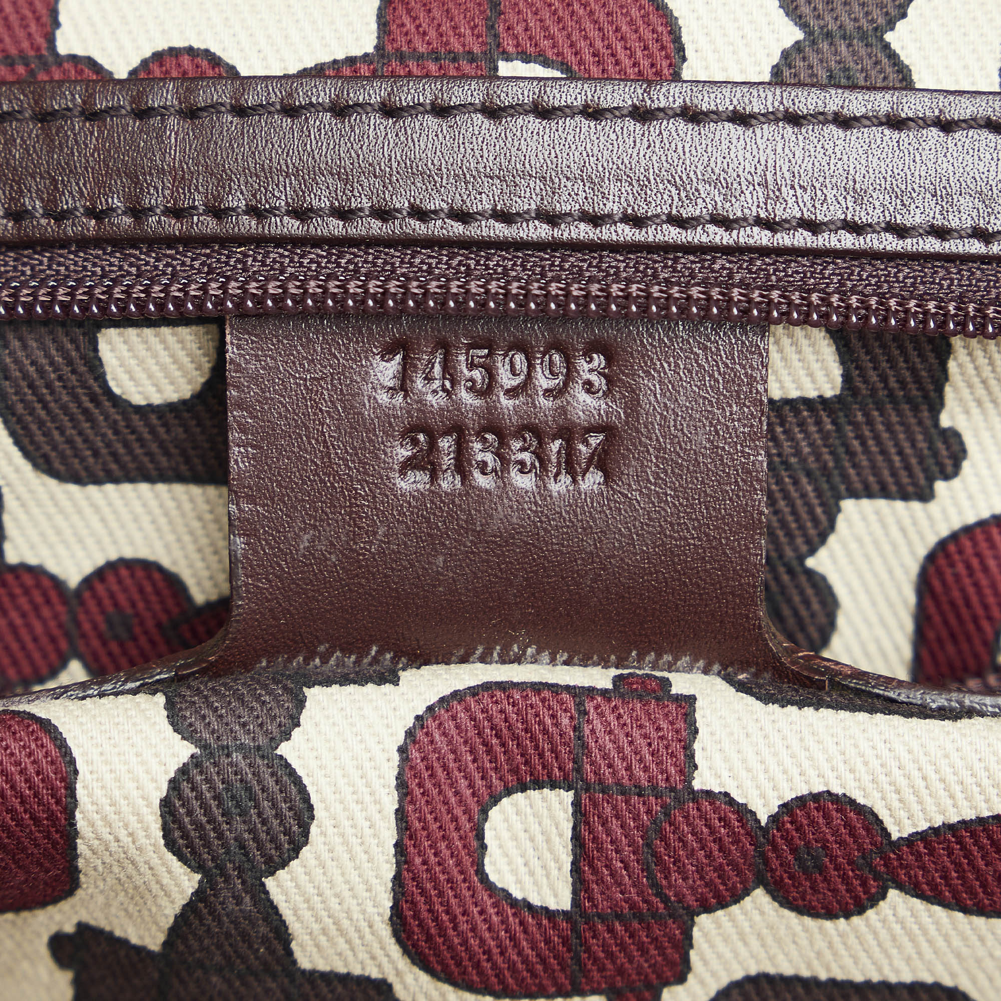 Product Details: Brown Gucci Guccissima Punch Tote Bag. This tote bag features an embossed leather body, flat leather shoulder straps, a top zip closure, an exterior slip pocket, and interior zip and slip pockets. 8.3′ L x 13′ W x 2.8′ D, 5.9′ drop. Serial number 145993.
