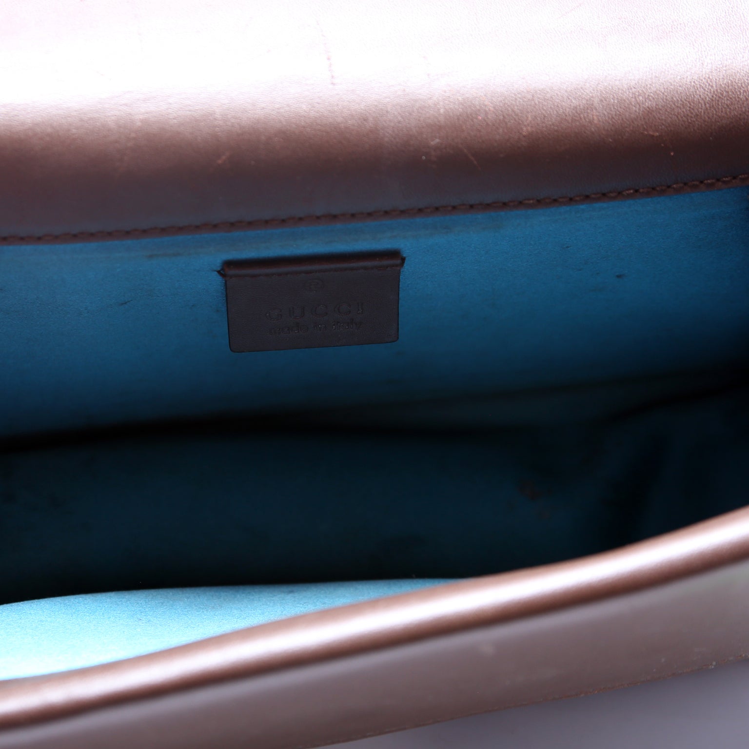 Interior: The interior has stains throughout. The interior features one flap pocket.