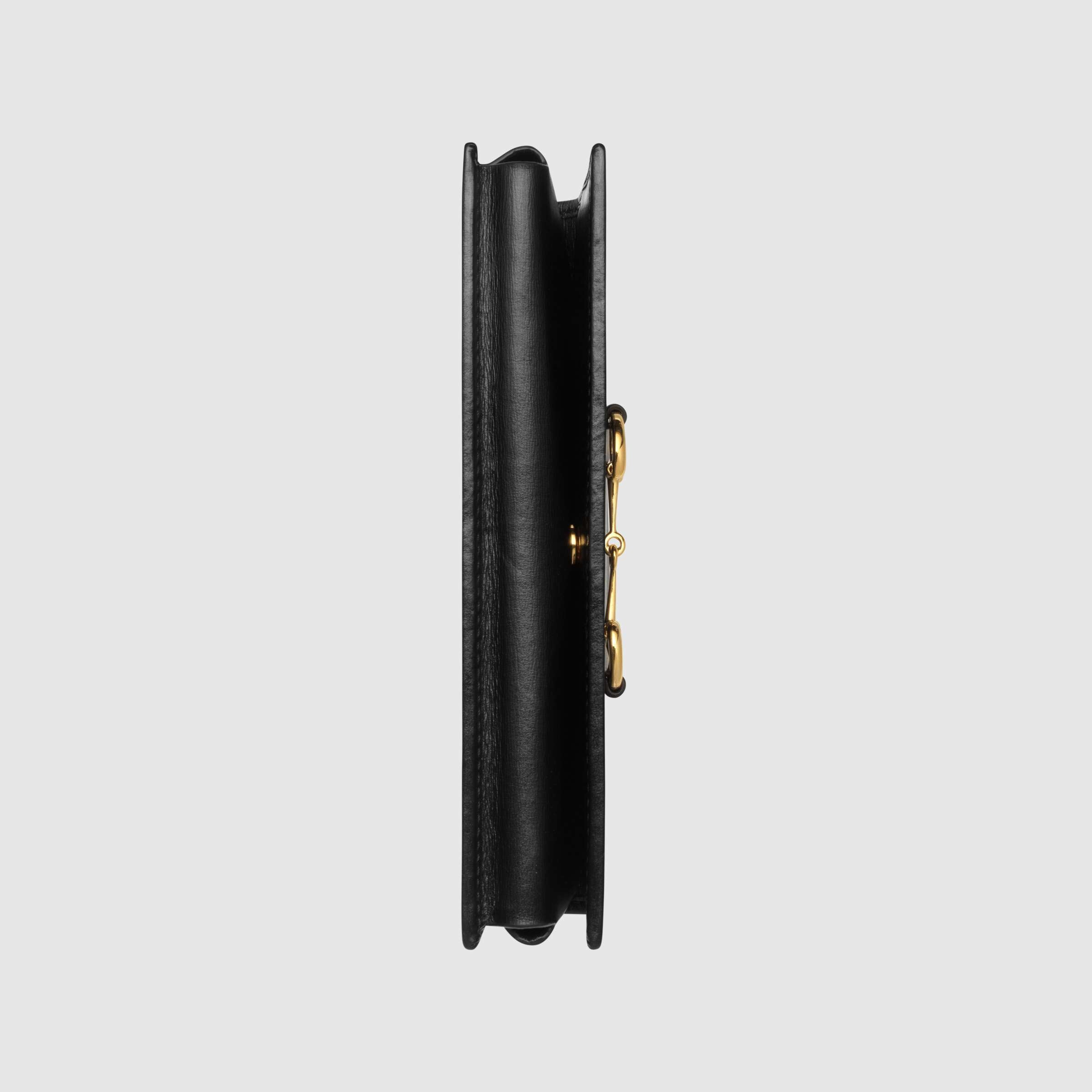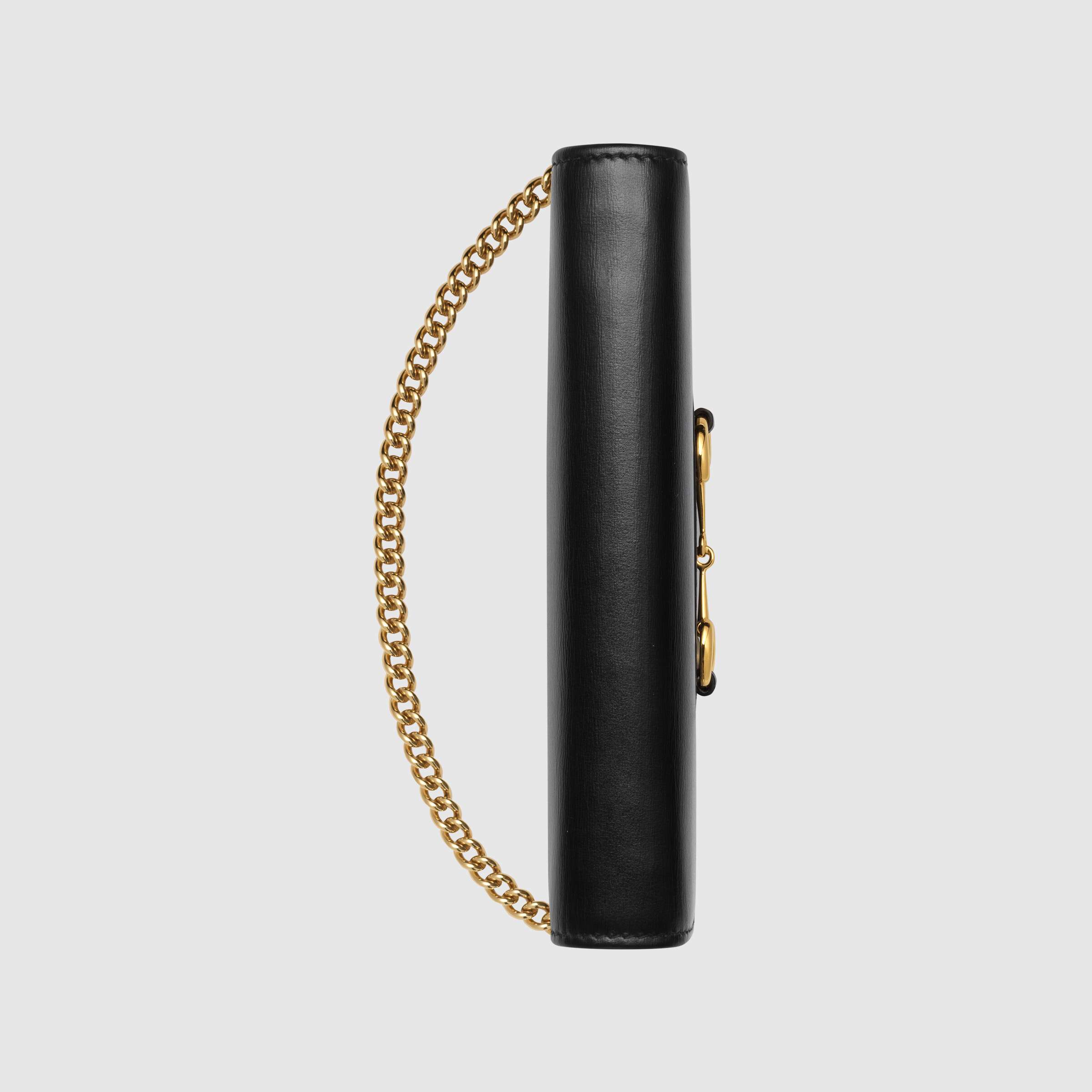 The chain wallet in black leather is introduced as part of the Gucci 1955 Horsebit accessories collection, defined by the double ring and bar design also found in Handbags. The folded snap-closure shape features several slots and pockets, completed with a detachable chain strap.