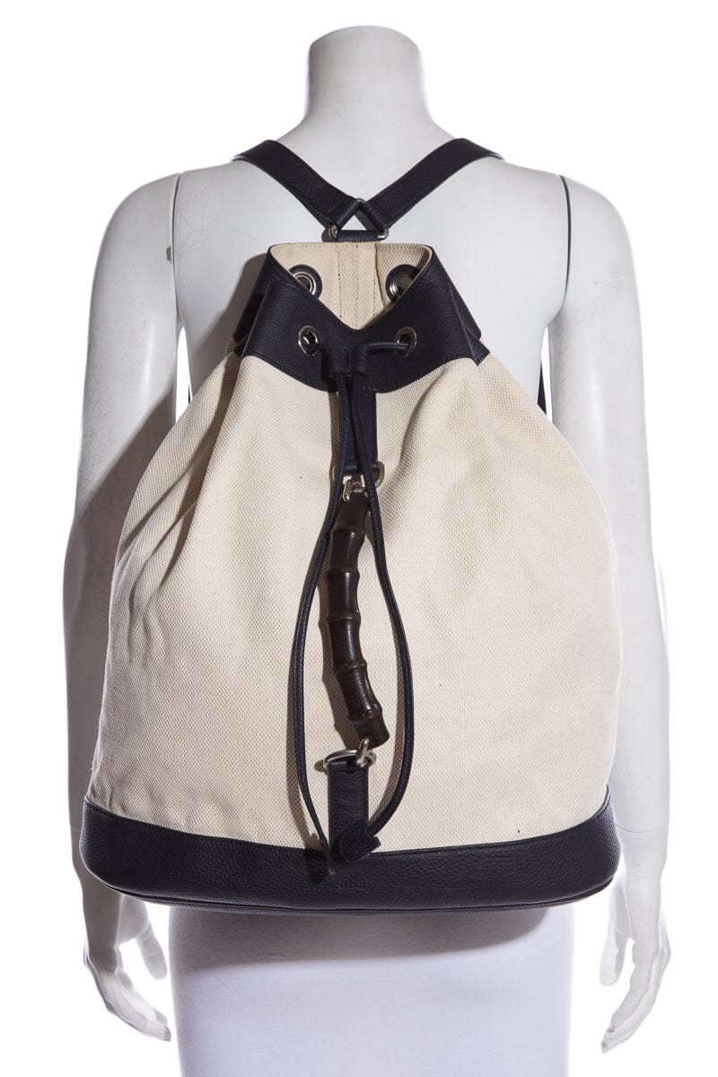 Gucci Canvas & Navy Bamboo Detail Bucket Backpack with silver hardware, and drawstring upper. This item is in very good condition.