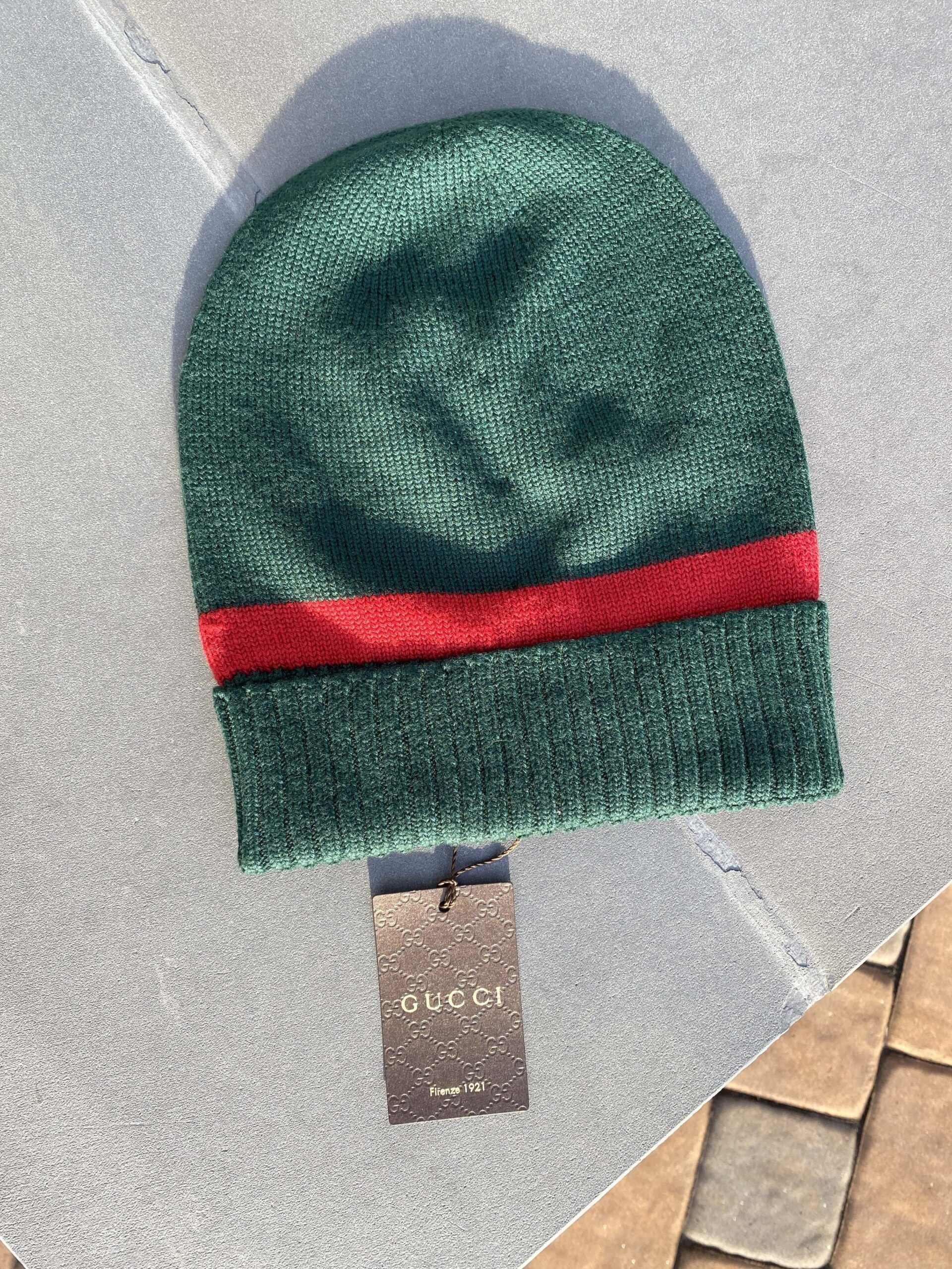 The Gucci GG Green Wool Beanie with Red Stripe is crafted from 100% wool, featuring an interlocking G logo and trim red stripe