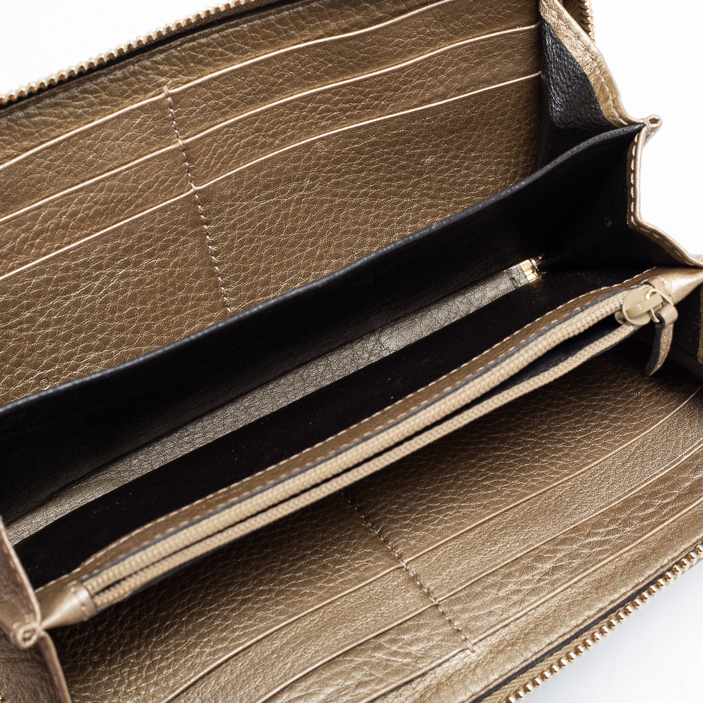 Compact and handy this wallet from Gucci will work well as an everyday accessory. It is crafted from gold leather and the leather fabric interior is divided into different compartments to safely secure your cards and cash. It is adorned with gold tone hardware.