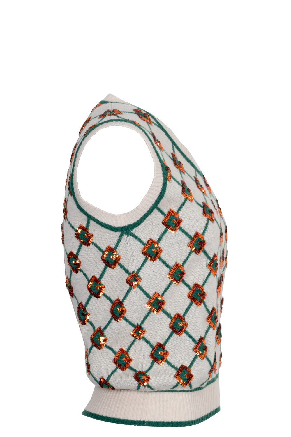Dieses auffällige Gucci Stricktop aus weicher Wolle mit funkelnden Pailletten und dem ikonischen GG-Muster ist ein wahres Statement-Piece. Die Kombination aus sattem Grün und Weiss verleiht dem Top einen einzigartigen Look, der jedes Outfit aufwertet. Perfekt, um Eleganz und moderne Coolness zu vereinen – ideal für besondere Anlässe oder als Highlight in deinem Alltagslook.