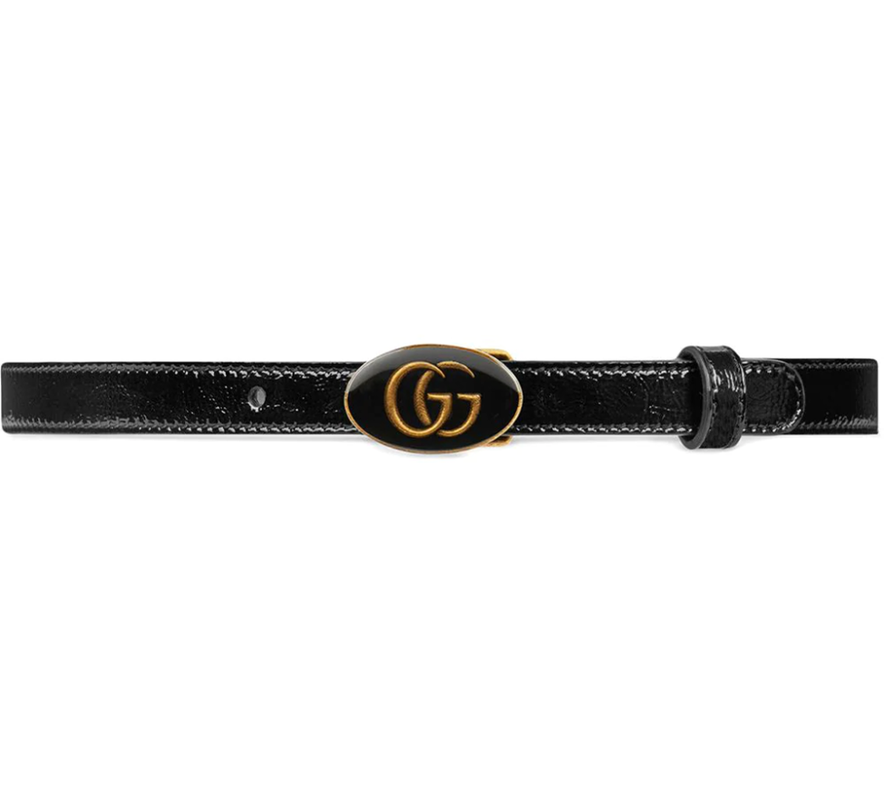 The Gucci Leather Belt with Oval Enameled Buckle in Black is a slim belt, complete with a tonal oval enameled buckle, set with the Double G logo in gold-toned metal.