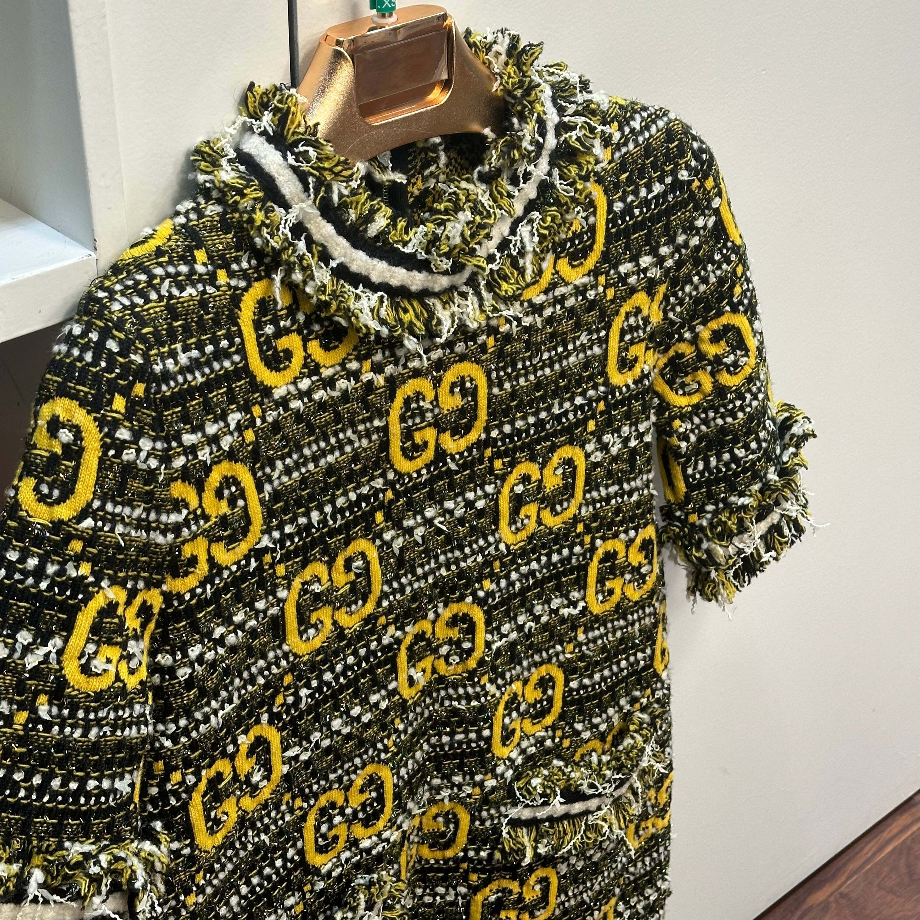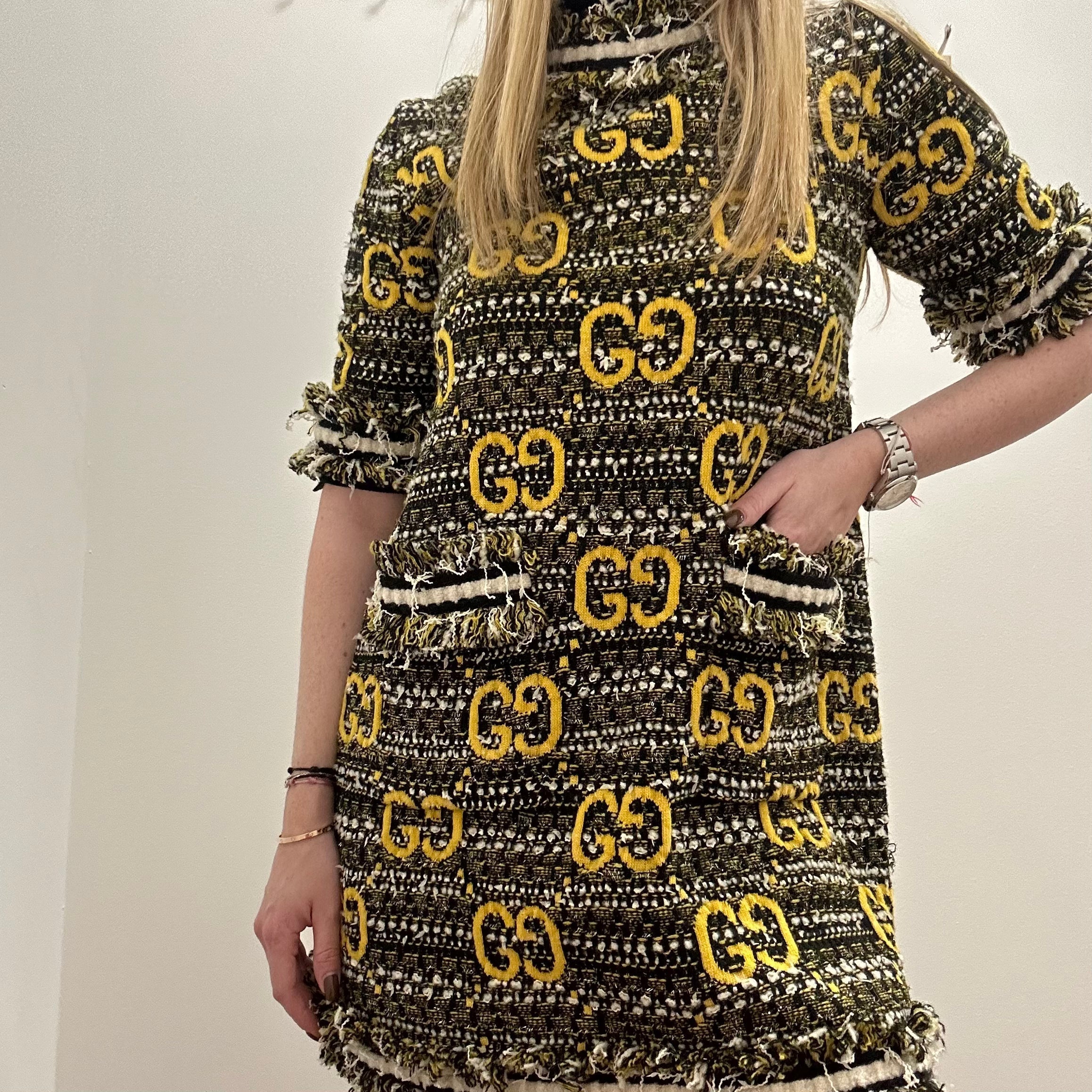 Robe en tweed GG jaune, blanche et noire. Élégante et moderne, nous vendons également la veste assortie pour le total look ! Petite fermeture éclair dans le dos.