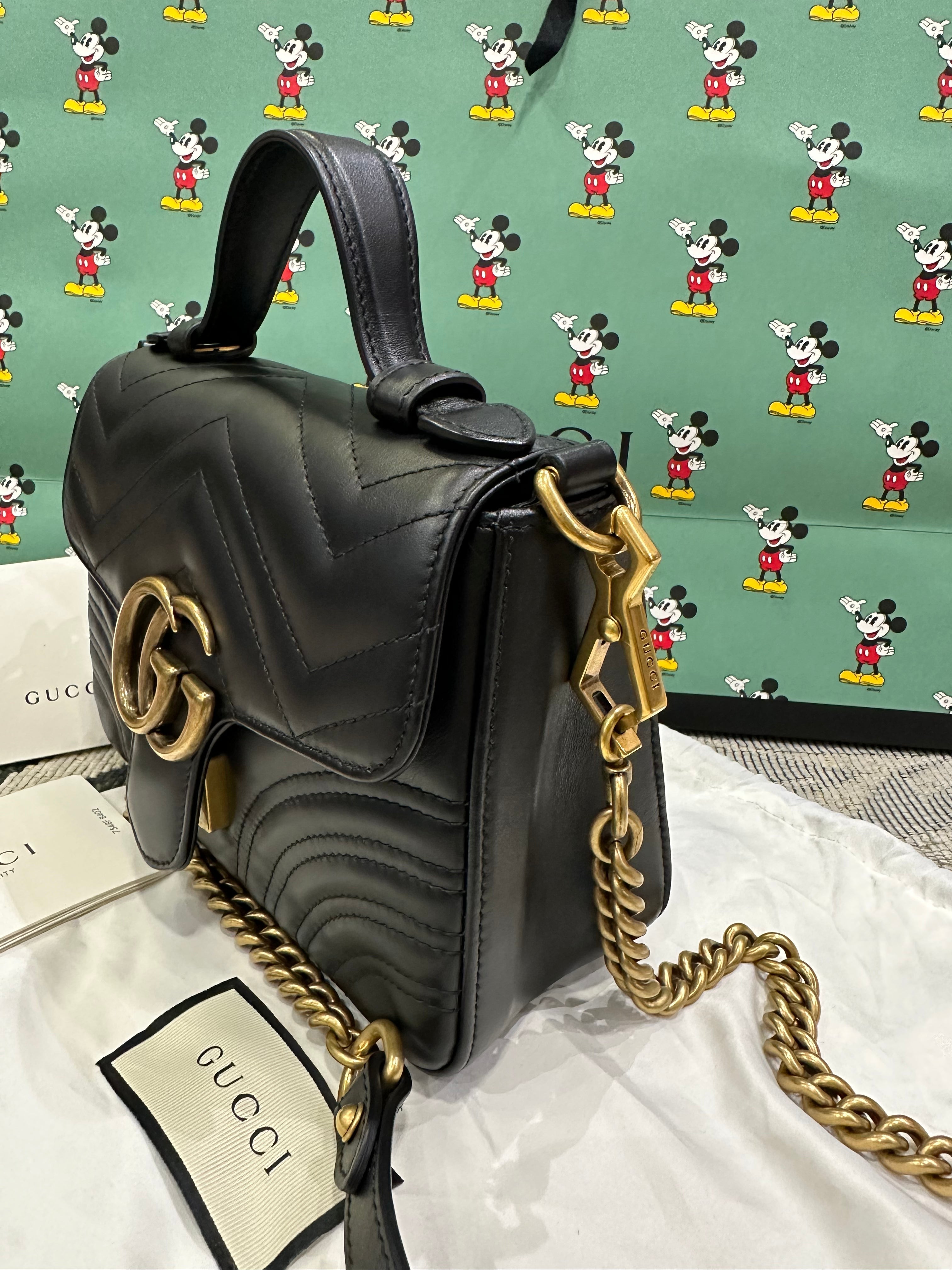 Sac Gucci en cuir lisse noir très résistant pour un usage quotidien, il vous est présenté en état parfait muni de son certificat original Gucci. L’intérieur est en daim beige rosé, la bandoulière permet de le porter en Crossbody et sa poignée pour porté main plus habillé.