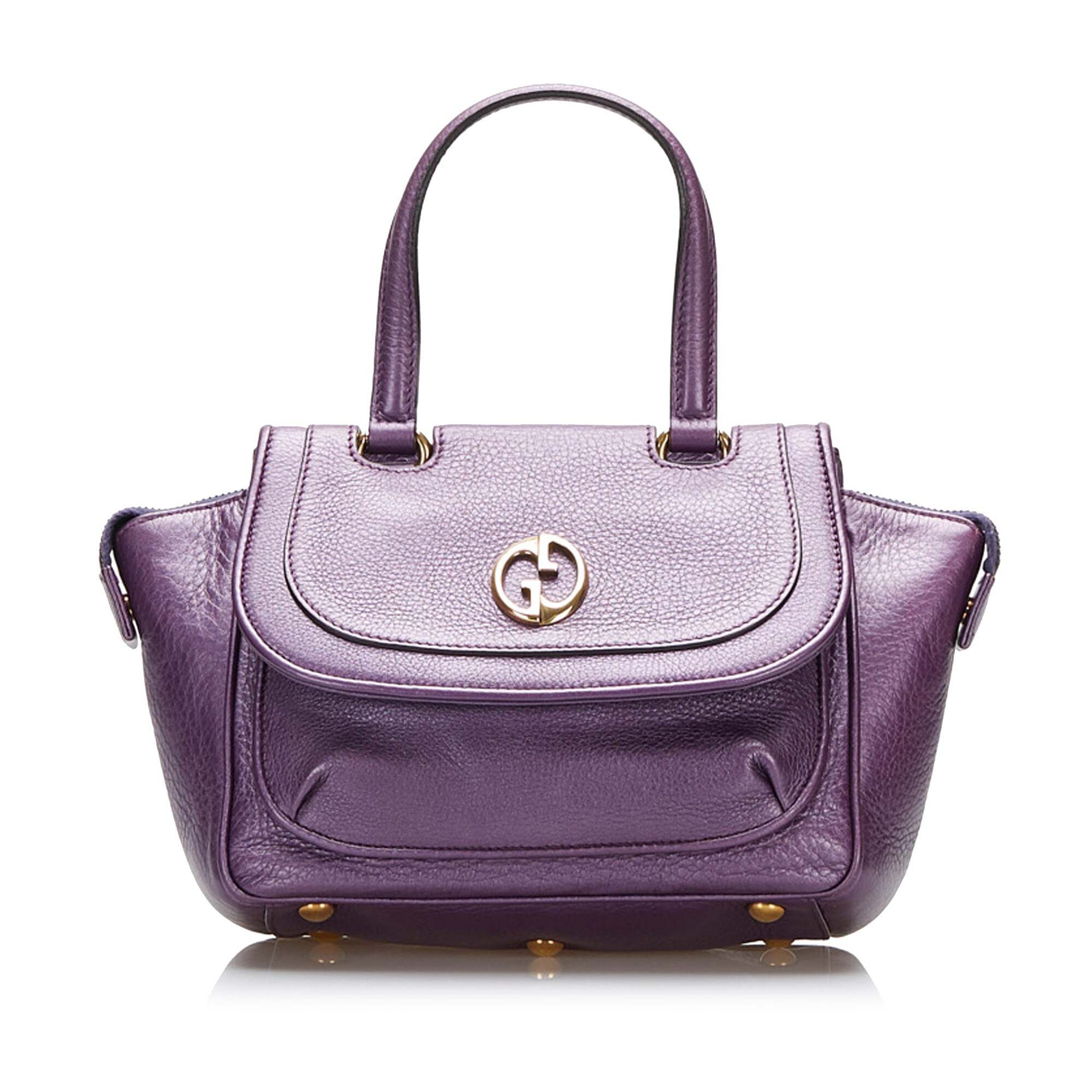 This handbag features a leather body, a front flap pocket, flat leather handles, a front flap with a metal Double G hardware, a top zip closure, and an interior slip pocket. Comes with dust bag
