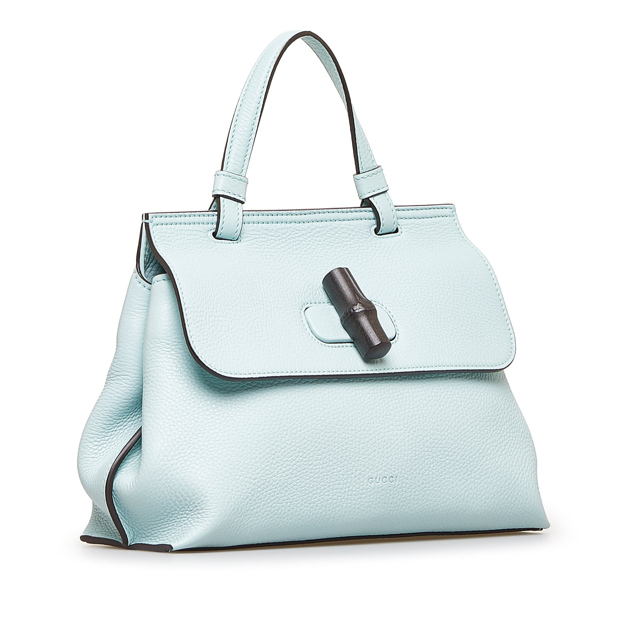 The Bamboo Daily features a leather body, a flat leather top handle, a detachable strap, a front flap with bamboo turn lock closure, and interior zip and slip pockets. Comes with dust bag