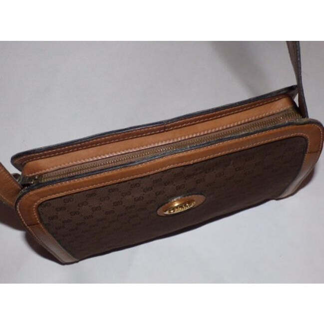 The bag is a logo, monogrammed, small ‘G’ style in brown. It has a cross body/shoulder strap and is a classic, rectangular shape with a zip clasp at the top. It has camel colored leather comprising the top, bottom, sides, body, and strap with the small G logo design fabric as the front and back.