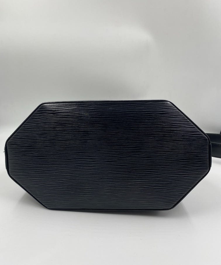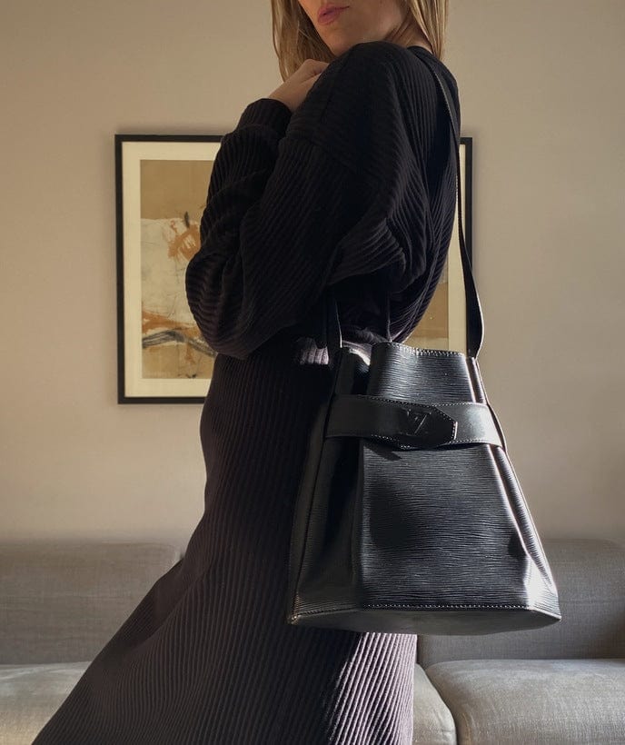 An Louis Vuitton black Sac D’epaule Epi leather shoulder bag. The bag is accessed by a leather strap embossed with the LV logo that is wrapped around the top of the bag and secured with a press stud. It can be carried on the shoulder with the wide adjustable shoulder strap. Inside is lined with a black suede lining.