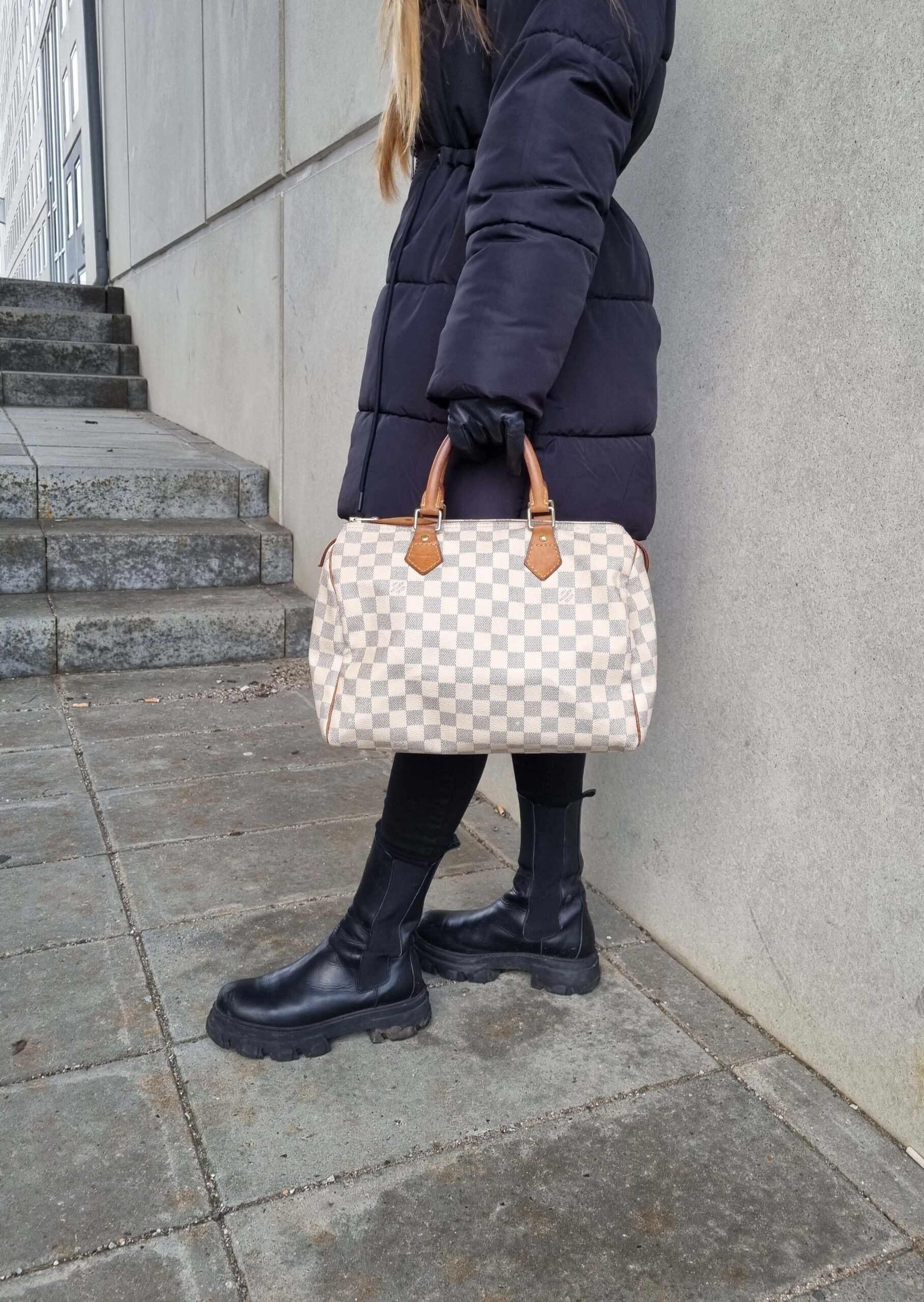 Louis Vuitton Speedy 30 Azur Damier in good condition with some signs of previous use. Specifically, some darkness on the handles. The interior remains in good condition thus some dirt.